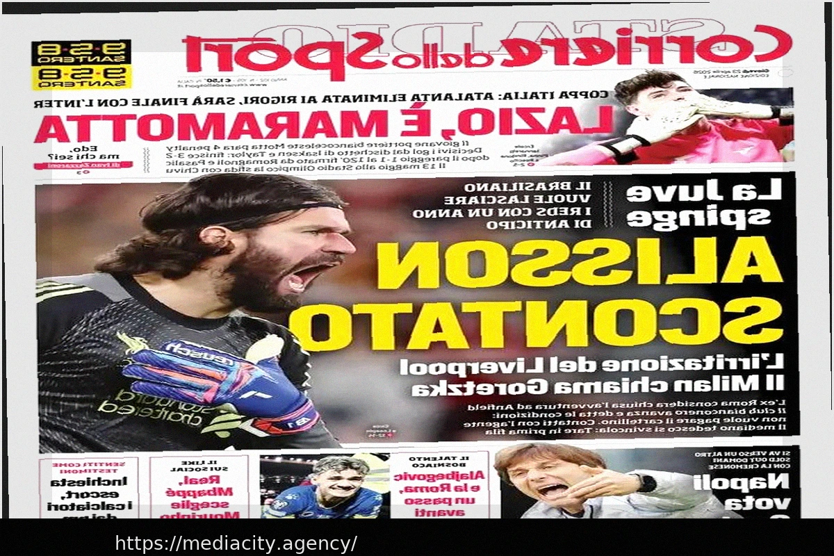 Два трансферных сообщения на первой полосе: “Ювентус” делает рывок в переговорах по Алиссону (“Sprint Alisson”), а “Милан” проявляет интерес к Горецке (“Mossa Goretzka”). Сообщается, что обсуждается трехлетний контракт с немецким полузащитником.